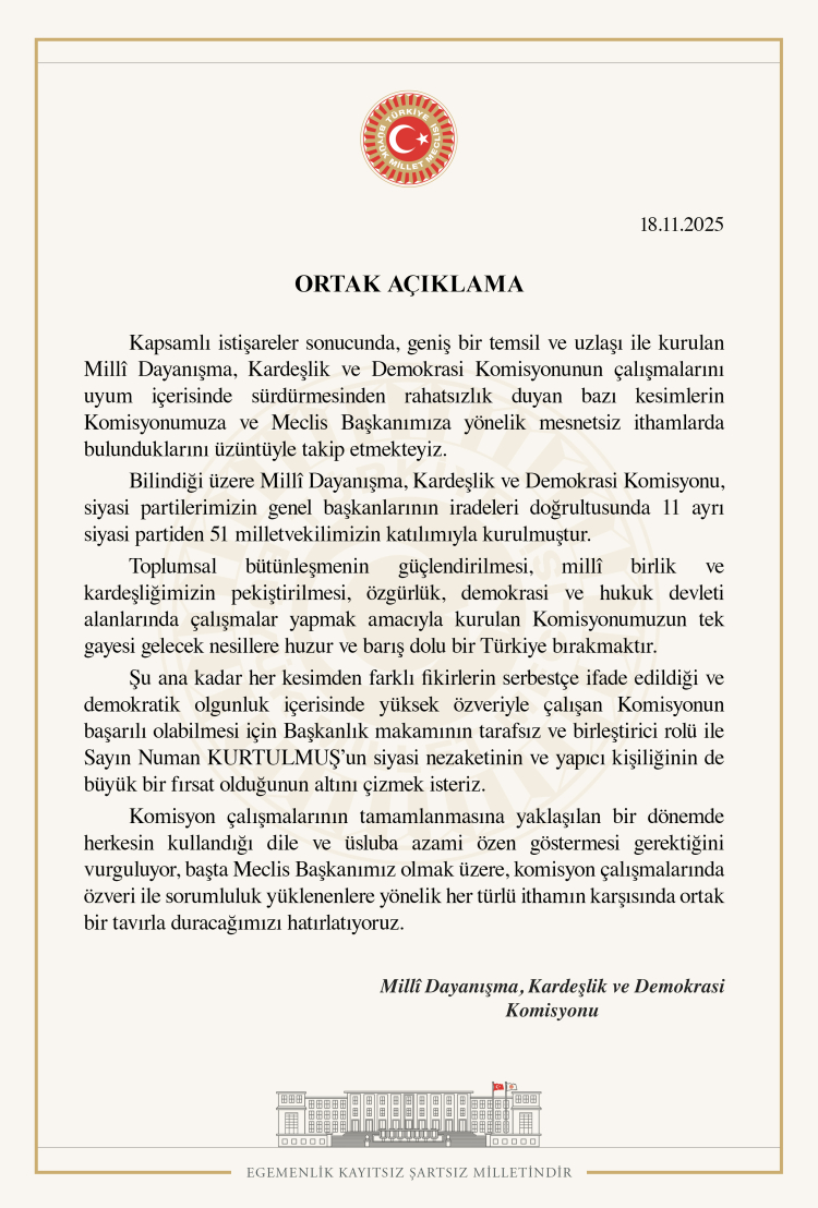 TBMM Başkanlığı’nın yazılı açıklamasında, komisyonun uyumlu çalışmalarından rahatsız olan bazı çevrelerin “mesnetsiz suçlamalarda bulunduğu” ifade edilerek, “Geniş bir temsil ve uzlaşı ile kurulan Komisyonumuza ve Meclis Başkanımıza yönelik ithamları üzüntüyle takip ediyoruz.” denildi.