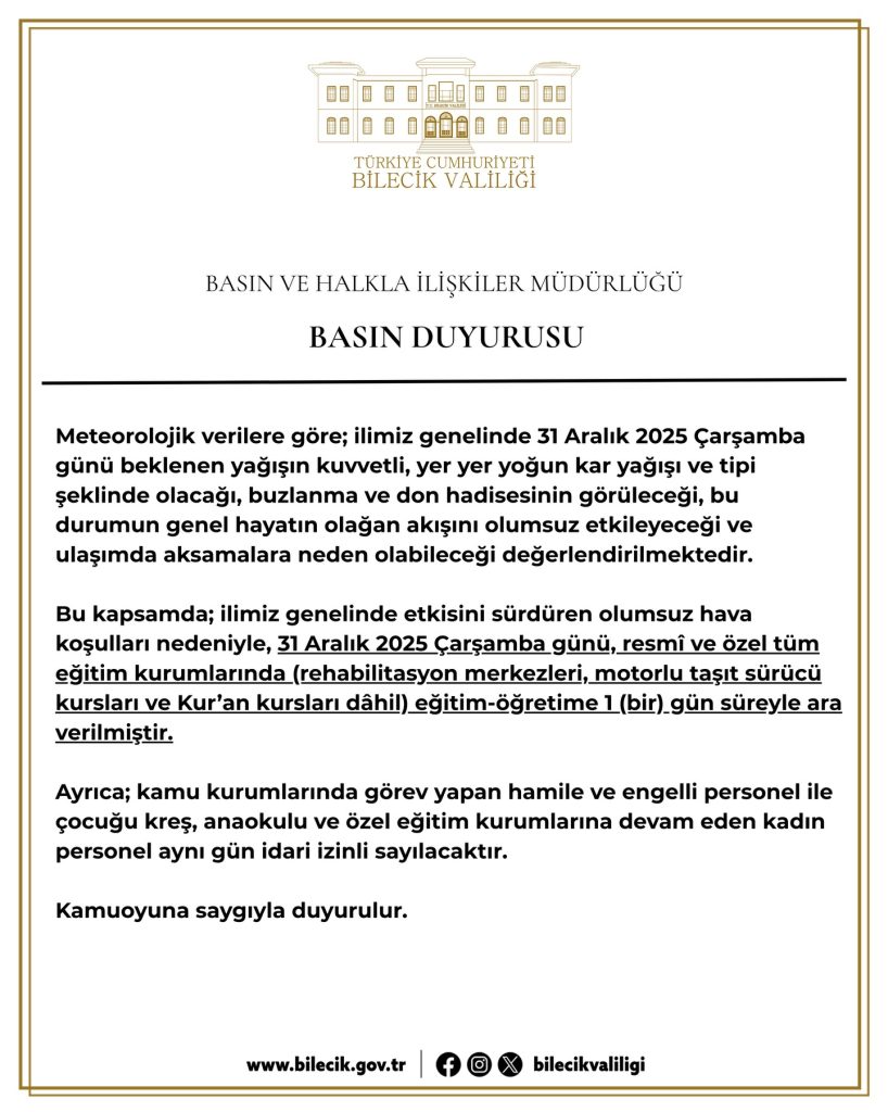 Bilecik’te etkisini sürdüren olumsuz hava koşulları nedeniyle öğrencileri ve velileri sevindiren haber Vali Faik Oktay Sözer’den geldi. Vali Sözer, 31 Aralık 2025 Çarşamba günü il genelinde eğitim-öğretime 1 gün süreyle ara verildiğini açıkladı.